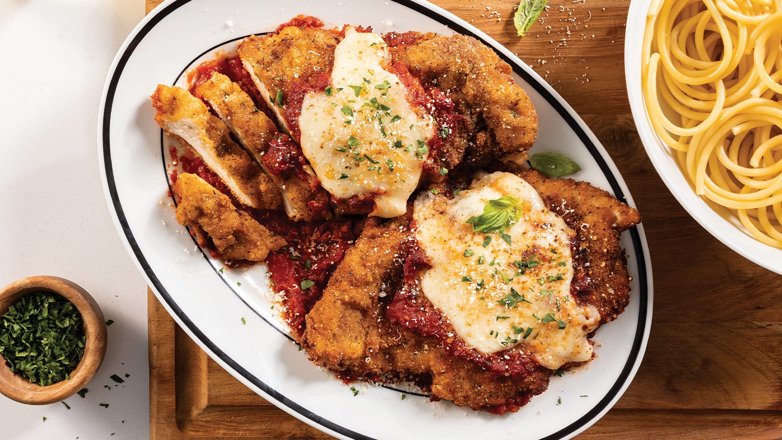 Mama mia! If you’re craving an Italian classic that’s guaranteed to have the whole table excited to mangia, you have to try our chicken Parmesan recipe! Plump and juicy chicken breasts are dredged in flour, dipped in a rich and creamy egg mixture, coated in a savory combination of salt, breadcrumbs, oregano, and thyme, and seasoned with pepper. Then they’re fried, topped with velvety marinara sauce, and sprinkled with Parmesan and mozzarella cheeses before being baked to crispy and gooey perfection. Wondering if there’s a better chicken Parmesan experience than this? Fuhgeddaboudit!