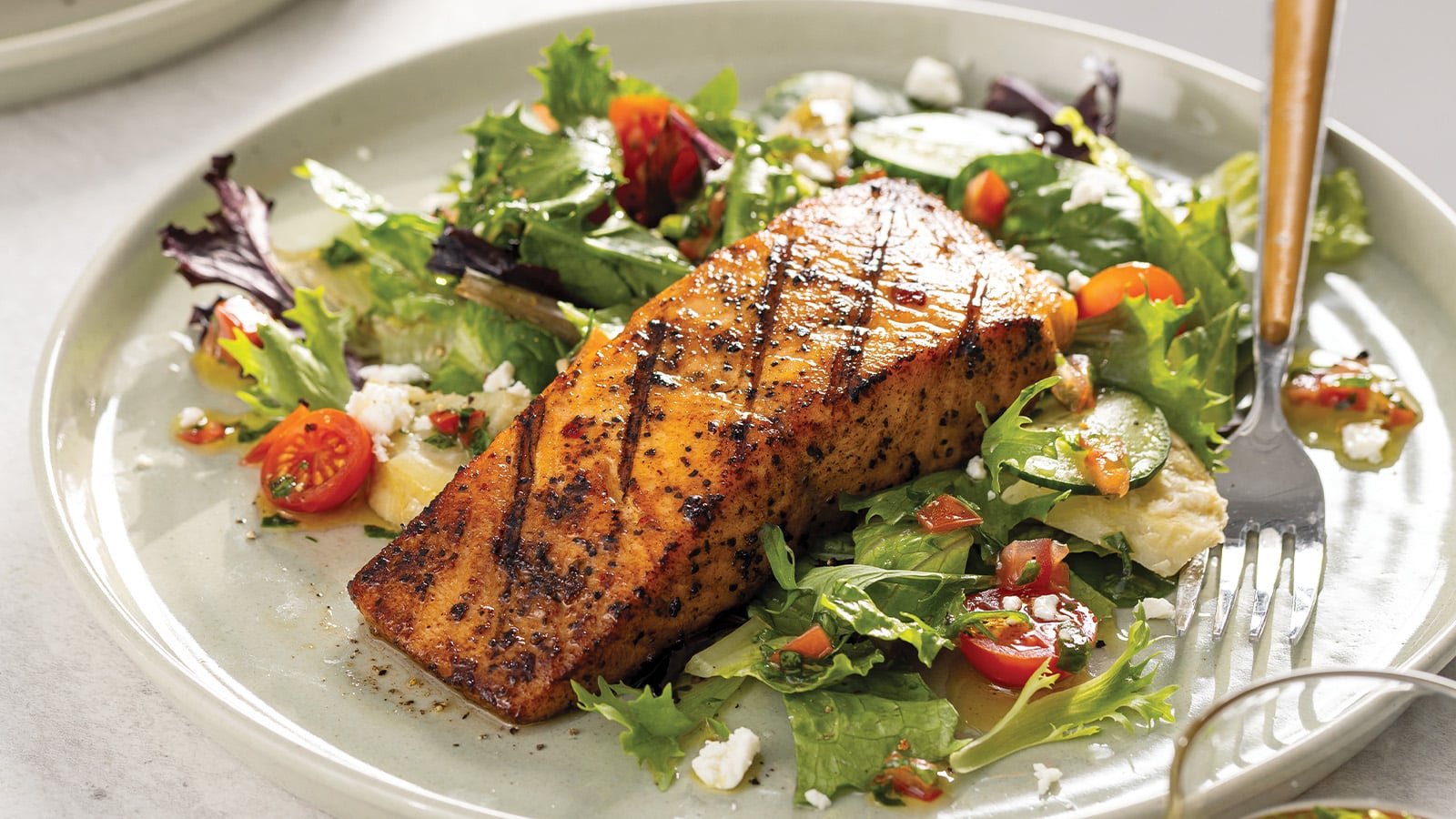 Light and refreshing, this grilled marinated salmon salad is perfect for a warm summer day when looking for a healthy option. Trade in your boring old salad recipe for this quick and easy recipe that is filled with loads of vegetables. Topped with our delicious Marinated Salmon Fillets, cherry tomatoes, and feta cheese and a made-from-scratch tomato basil vinaigrette that pairs perfectly with our salmon, this salad includes ingredients that no one can turn down. Follow the recipe and steps below to prepare your flavorful salmon salad.