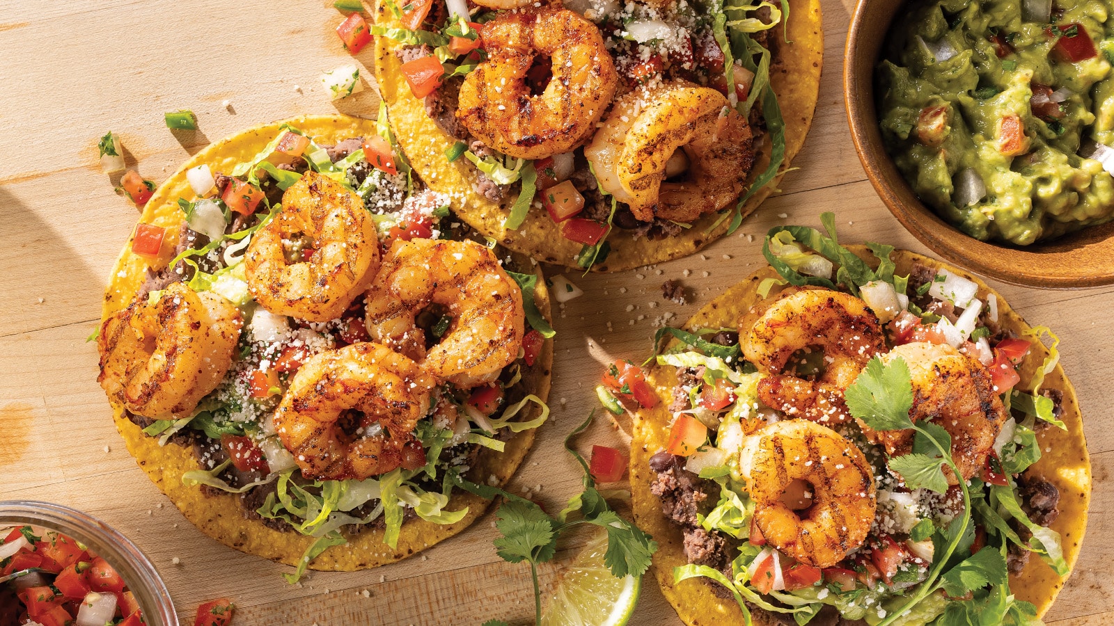 The shrimp will cook quickly, so it’s best to prepare the pico de gallo and guacamole before grilling. Create the perfect shrimp tostada by layering your ingredients in the following order: tostada, a layer of refried beans, shredded Romaine lettuce, pico de gallo, and then guacamole. Top with 3-4 grilled shrimp per tostada and sprinkle with Cojita cheese. Add a cilantro sprig and lime wedge to garnish. Serve and enjoy!