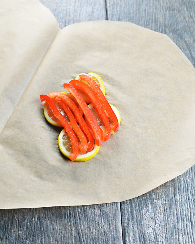 2. Unfold the heart, with the point at the top. Next, pile on your aromatics, vegetables and protein in the middle of the heart, on one side of the fold. I added a layer of thinly sliced lemon, followed by red bell pepper, thinly sliced red onion and halved cherry tomatoes. Next came the gorgeous tuna. I love the bright red color of the fish next to the fresh veggies.