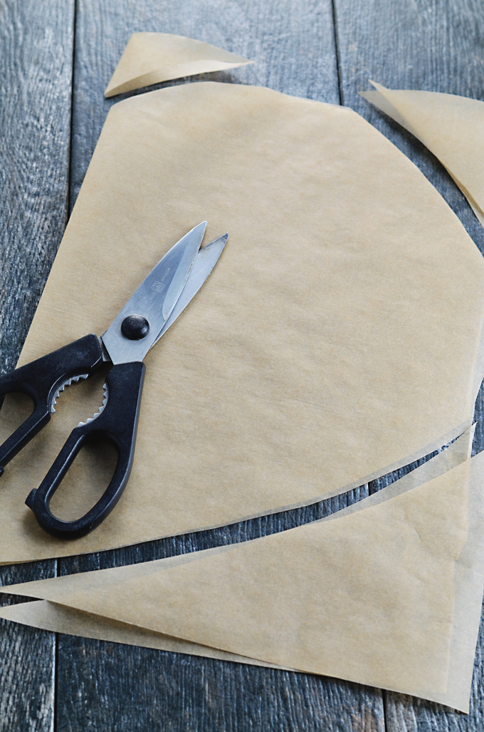 1. To cook en papillote for four, you’ll need four 14-inch by 12-inch sheets of parchment paper or foil. To cut your first packet, fold one sheet in half and cut out a heart shape.