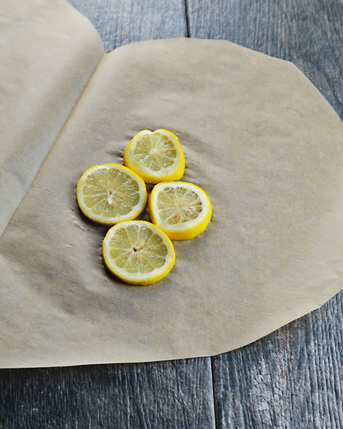 2. Unfold the heart, with the point at the top. Next, pile on your aromatics, vegetables and protein in the middle of the heart, on one side of the fold. I added a layer of thinly sliced lemon, followed by red bell pepper, thinly sliced red onion and halved cherry tomatoes. Next came the gorgeous tuna. I love the bright red color of the fish next to the fresh veggies.